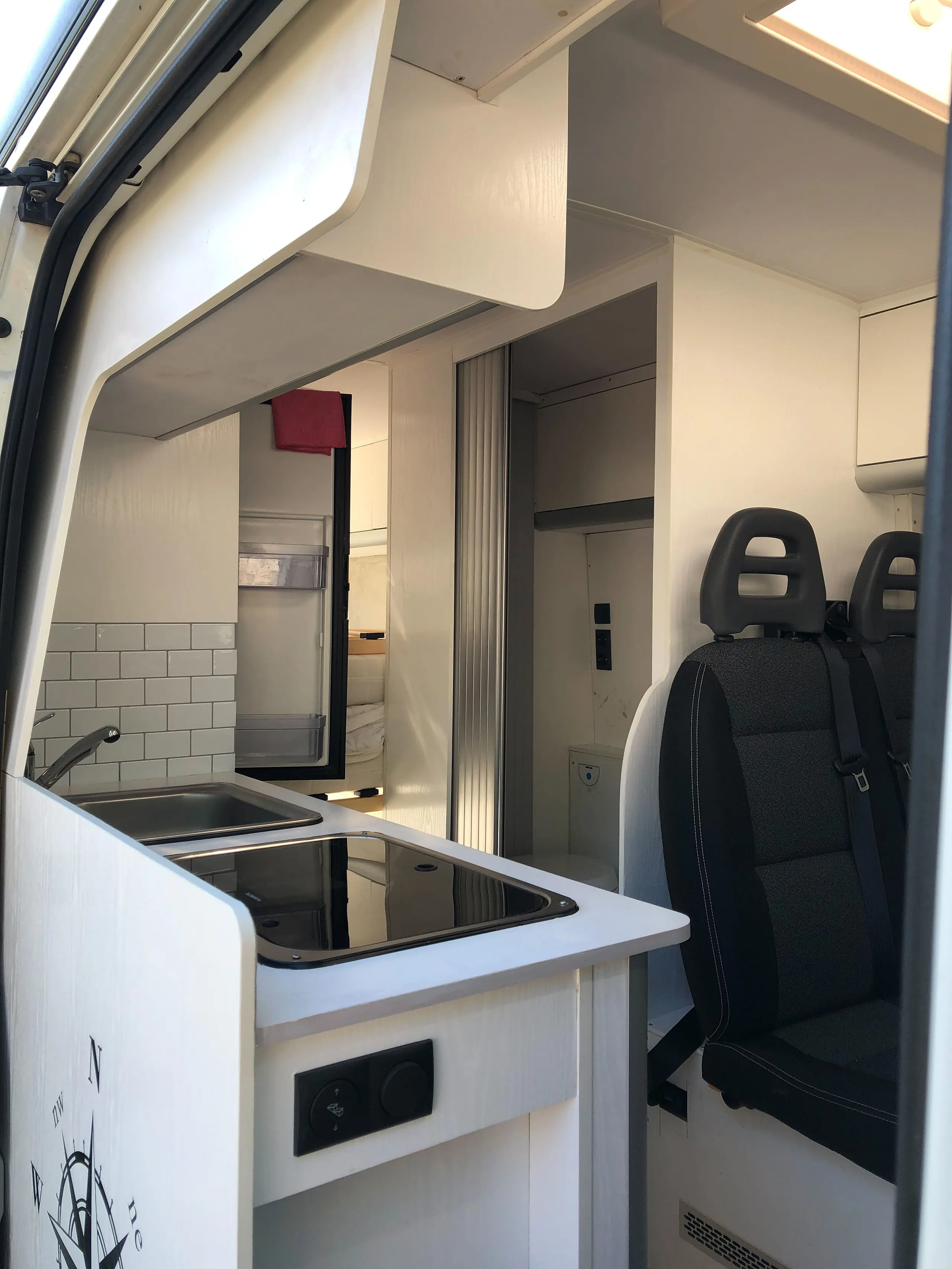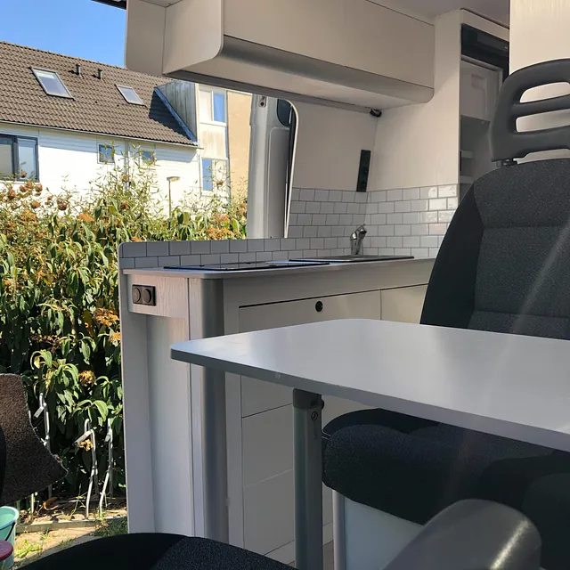 De ruime badkamer is uitgerust met warm en koud water, stroompunten, verlichting, kastjes en een schuifdeur. Een buitendouche is mogelijk via een doucheslang die via het toiletvenster of de achterzijde gebruikt kan worden. De keuken bevat een tweepits gasfornuis, wasbak en een koelkast met vriesvak. Achterin vind je de gaskast voor twee gasflessen en de meterkast voor alle elektra en verlichting. De hele camper is voorzien van sfeervolle, praktische verlichting.